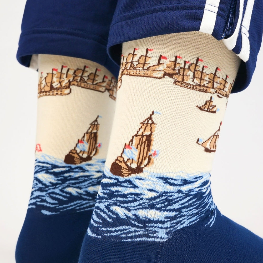 Willem van de Velde der Ältere war kein gewöhnlicher Künstler – er war ein echter „eingebetteter Journalist“, der die Schlacht von Solebay von einem niederländischen Schiff aus festhielt. Seine Skizzen verwandelte er später in Entwürfe für monumentale Wandteppiche, die von König Charles II. in Auftrag gegeben wurden. Jedes Detail auf diesen Socken – von den roten Flaggen bis zu den charakteristischen Wellen – basiert auf diesem jahrhundertealten königlichen Auftrag.