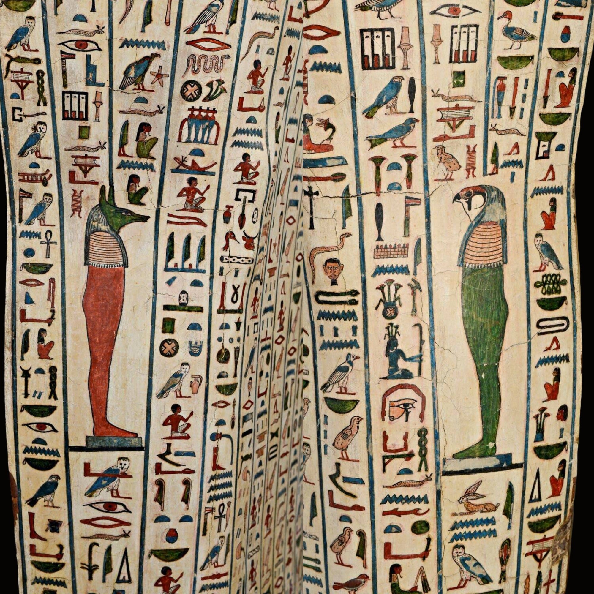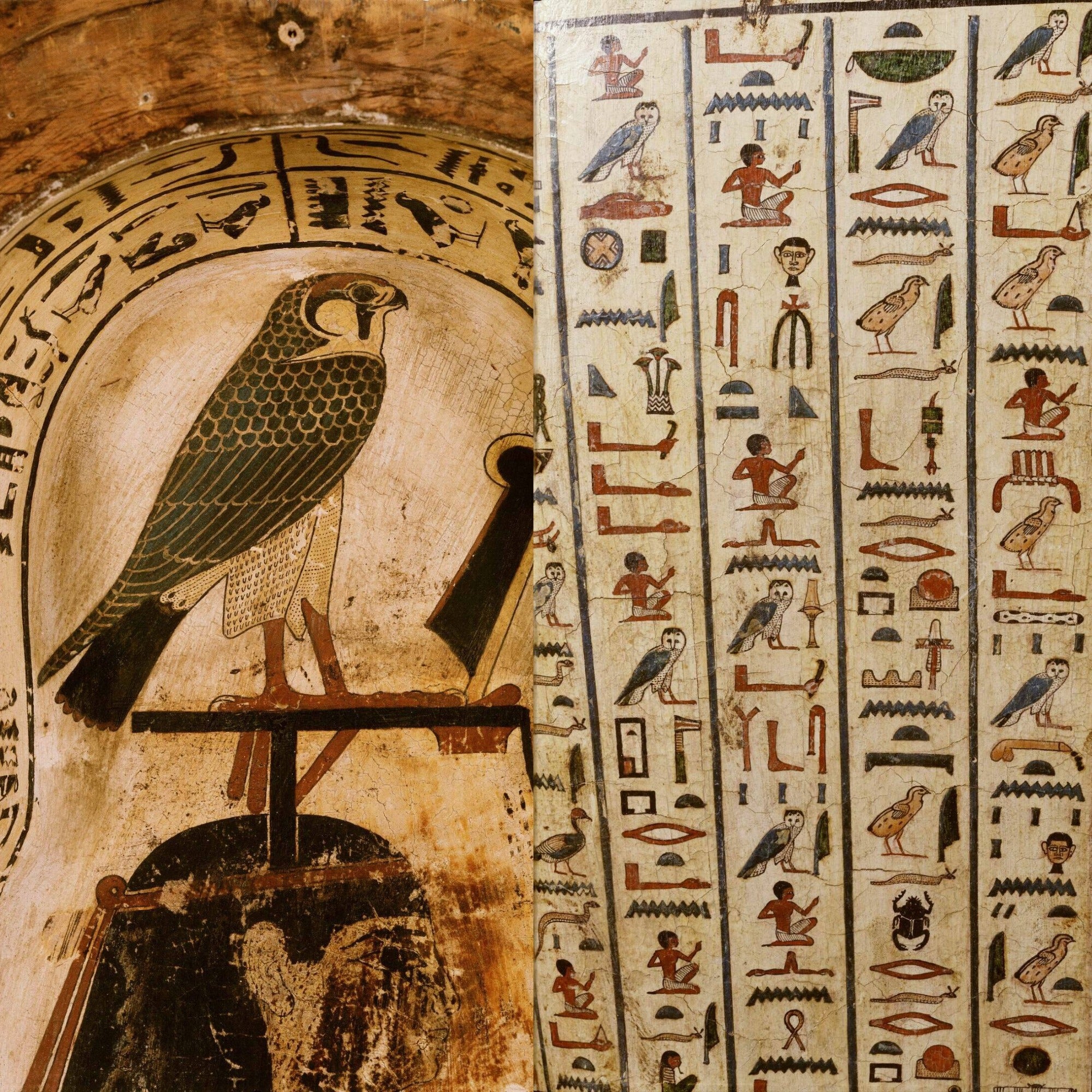Ein Vogel ist ein Gott. Der andere ist ein Buchstabe. Der Falke auf dieser Socke ist Horus, Sohn des Osiris und verantwortlich für die Bestattungsrituale seines Vaters. Die Eule daneben ist die Hieroglyphe für den Laut "-m", gefolgt von einer Fahnenstange – dem Zeichen, das an Tempeln stand und verwendet wurde, um Götter zu kennzeichnen. Zusammen bilden sie einen Teil des Namens von Atum, dem Schöpfergott. So kommunizierten die Ägypter: Bilder waren Worte, Worte waren heilig.