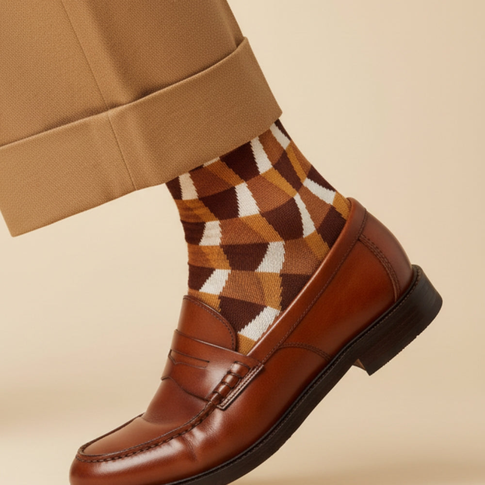 Die Kraft der Wiederholung: wenn eine einfache Form unendlich wiederholt wird, entsteht etwas Hypnotisierendes. Dieses Design übersetzt dieses Prinzip in ein rhythmisches Muster gestapelter Formen in warmen Erdtönen – Braun, Terrakotta und Off-White, die zusammen eine endlose Säule bilden.