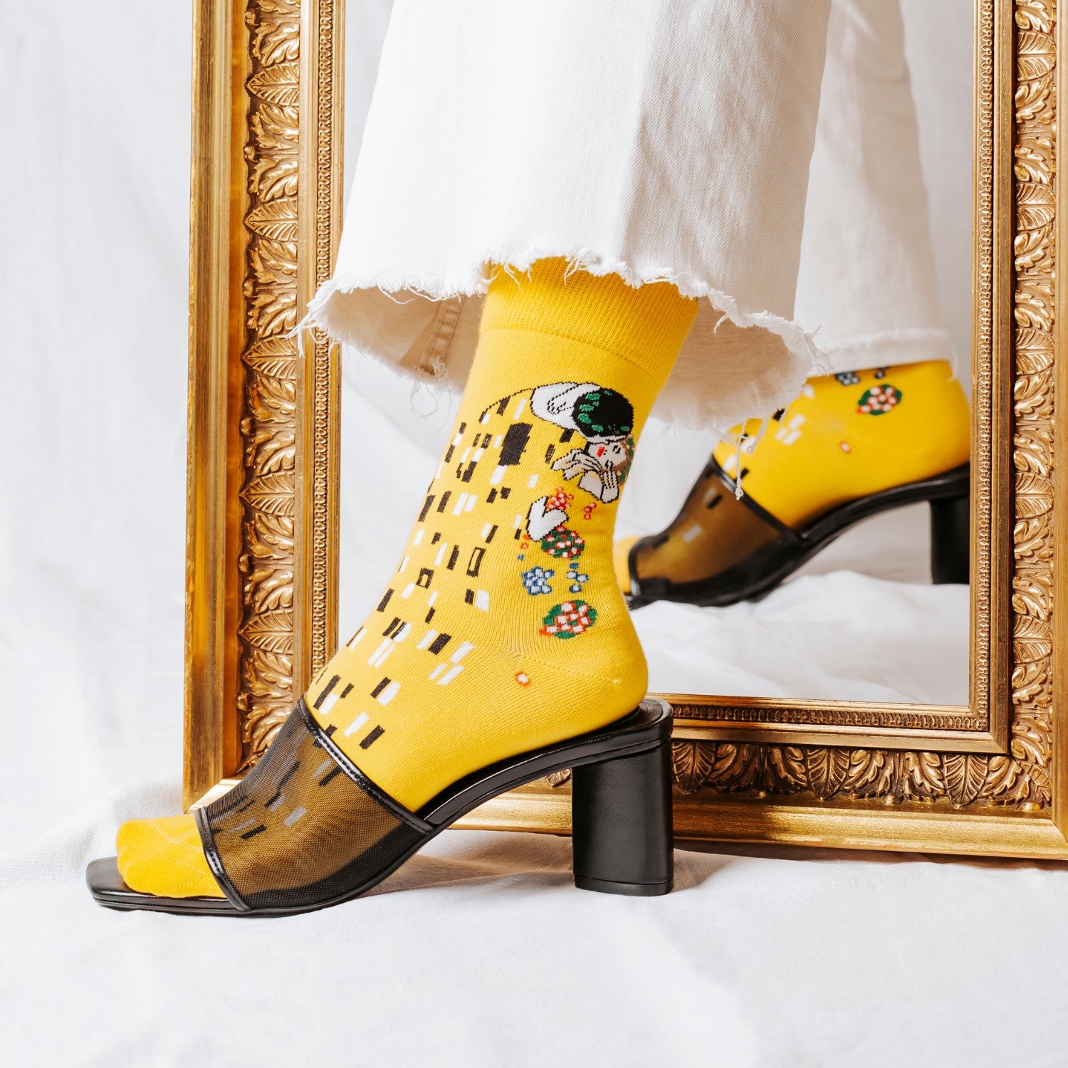 Dieses 3er-Pack vereint die berühmtesten Gesichter der Kunstgeschichte. Vom geheimnisvollen Lächeln der Mona Lisa bis zur liebevollen Umarmung von Der Kuss – jede Socke in dieser Kollektion trägt ein Porträt, das die ganze Welt kennt und liebt.