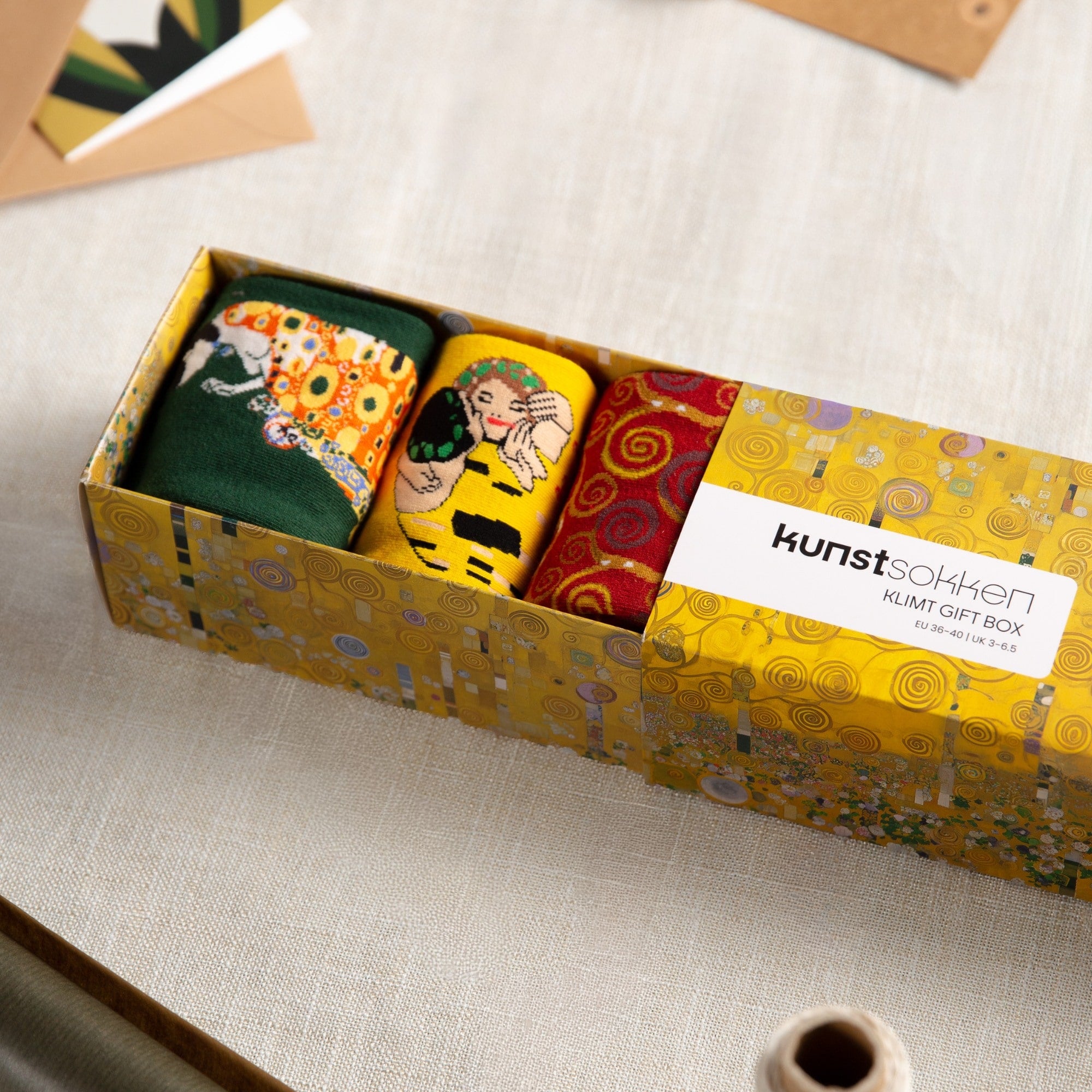 Die Verpackung wurde zu Ehren von Klimts Kunst entworfen und hat raffinierte Details, die die Socken super ergänzen.