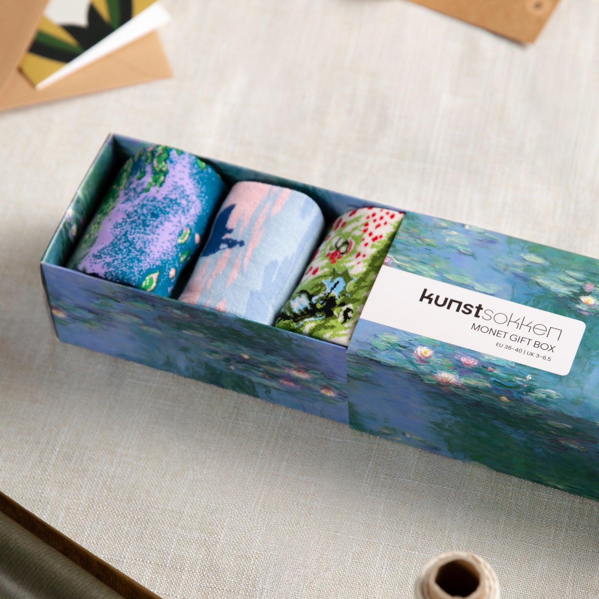 Die Verpackung wurde zu Ehren von Monets Kunst entworfen und hat raffinierte Details, die die Socken wunderbar ergänzen.