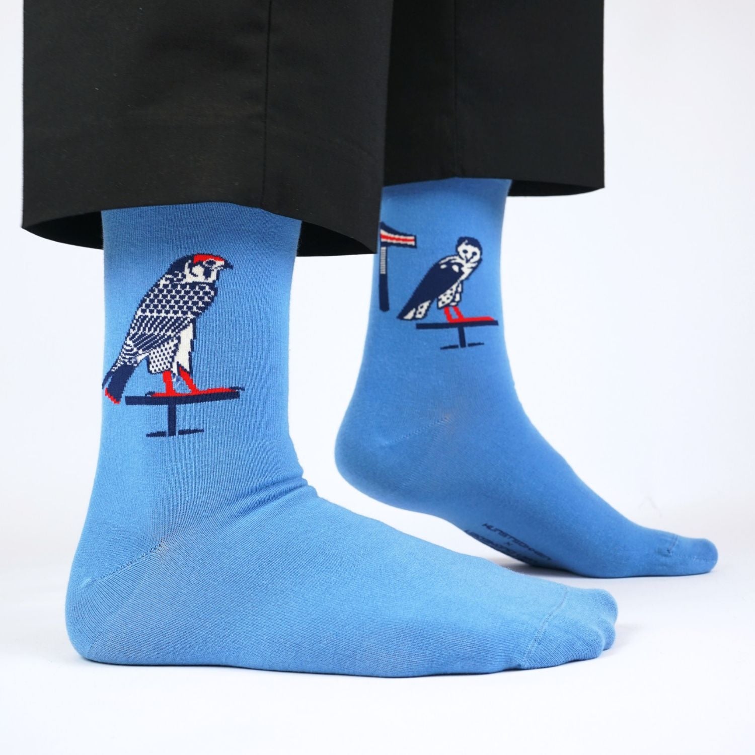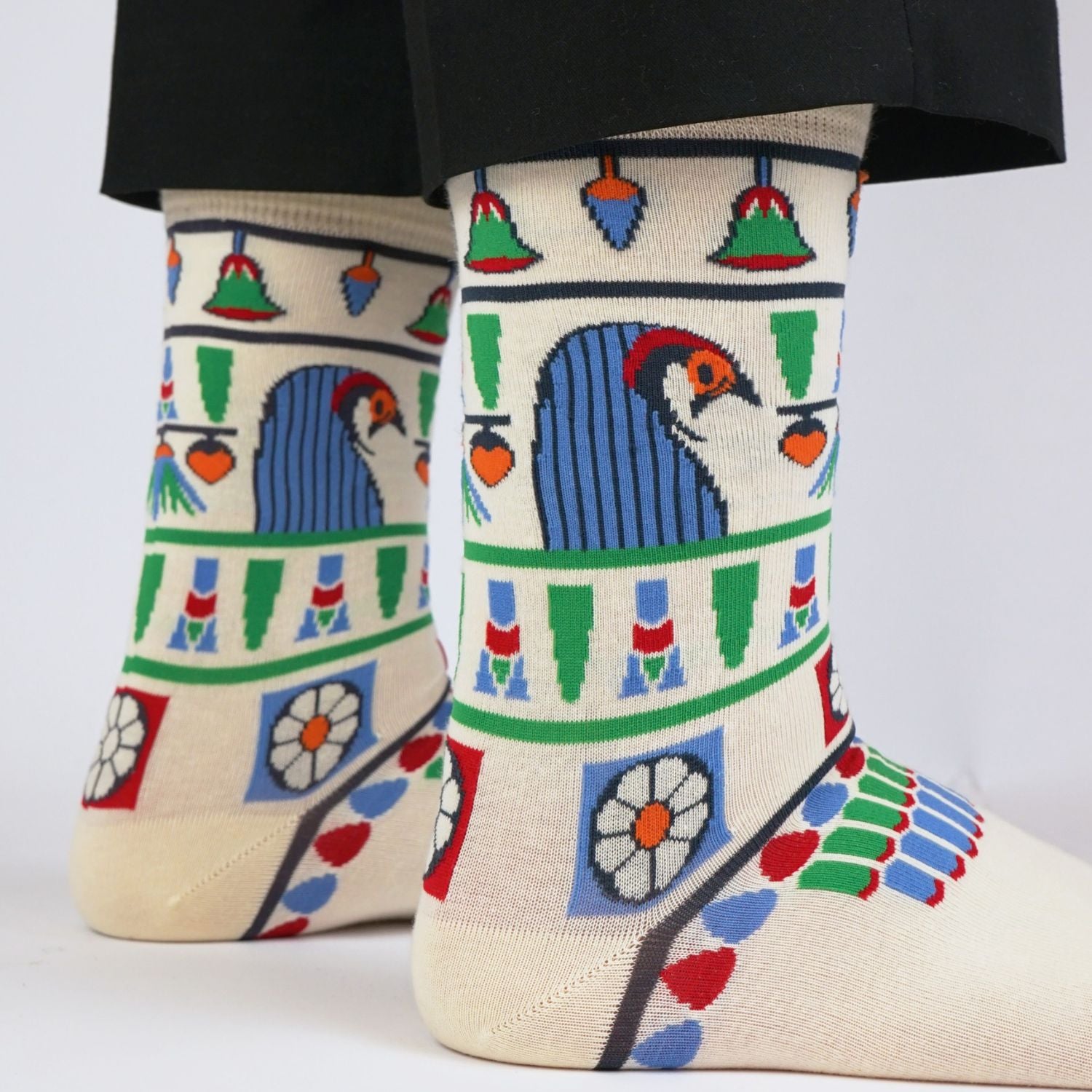 Erlebe die Zusammenarbeit zwischen Kunstsokken und dem Rijksmuseum van Oudheden mit diesem exklusiven 2er-Pack. Dieses Set enthält zwei Limited Edition Designs: 'Ägyptische Vögel' mit dem heiligen Falken und der Eule, und 'Blumenkette' mit dem prächtigen breiten Kragen des Osiris – beide inspiriert vom 2.600 Jahre alten Sarg des Peftjaoeneith.