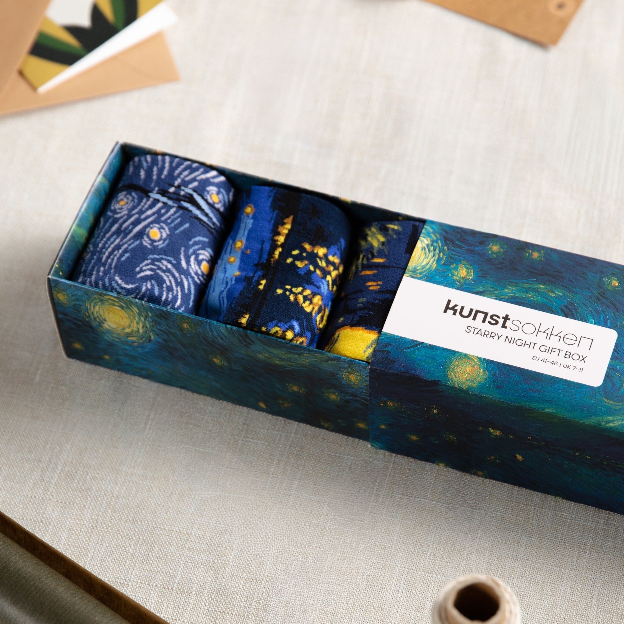 Die Verpackung wurde entworfen, um Van Goghs Kunst zu ehren, mit raffinierten Details, die die Socken wunderbar ergänzen.
